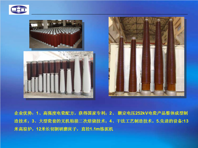 生产经营各类输变电高压绝缘子是公司的核心业务之一。目前主要生产530kN及以下悬式瓷绝缘子、145kV及以下线路柱式瓷绝缘子以及电气化铁道交通用瓷绝缘子,其中530kN等级产品是目前我国悬式绝缘子系列产品强度等级最高的瓷绝缘子,是我国正在发展百万伏级特高压输电线路所必需的绝缘子。公司既有传统的湿法生产线又有先进的干法生产线。先后为三峡工程、四川二滩、葛洲坝等国家重大电力建设项目和大秦线、鹰厦线、广深线等重要铁路建设提供了大量优质产品。根据国家规划,“十二五”期间电网投资额比“十一五”同比提升约66.7%,达到2.55万亿,其中,特高压电网和农网将成为增长最快的两个方向。随着国家电网改造、西电东送高等级输配电线路和高速铁路建设的不断发展,对电瓷产品的需求也不断加大,公司生产的各类瓷绝缘子产品有着稳定、广阔的市场需求和发展前景
