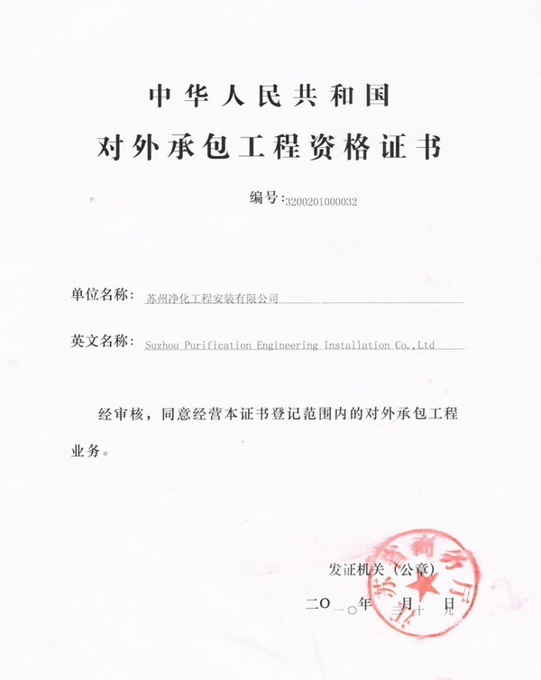 经江苏省商务厅批准,苏净集团控股子公司——苏州净化工程安装有限公司获“中华人民共和国对外工程资格证书”。(苏净集团提供)