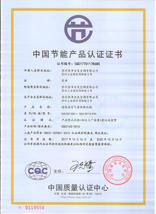 江苏苏净: “超低温空气源热泵机组”荣获中国节能产品认证